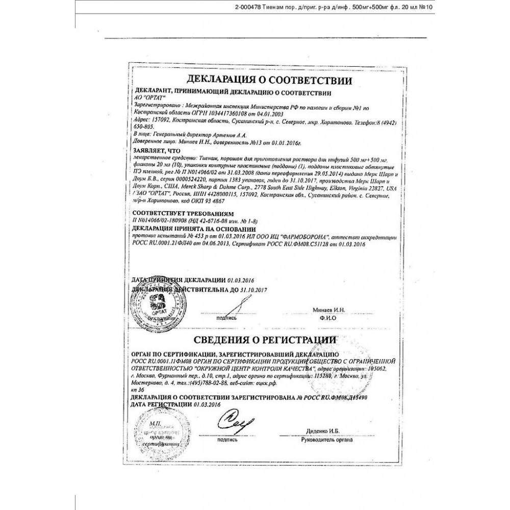 Противопоказания. Абсолютными противопоказаниями к применению Тиенам являются гиперчувствительность к препарату, период беременности и лактации, детский возраст до 3 мес., тяжелая почечная недостаточность у детей. Нельзя назначать Tienam больным с дисфункцией внутрисердечной проводимости, а также пациентам в шоковом состоянии.